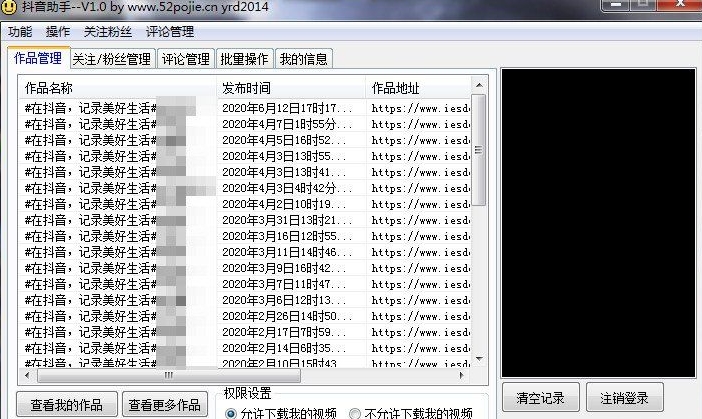 1.本程序是用于管理自己抖音账号内的作品,关注/粉丝,评论等,支持批量操作,方便实用!